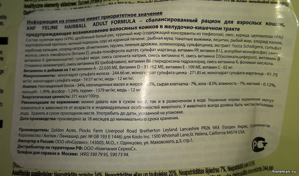 [b]Donkey[/b], Вам недостаточно тех рекомендованных кормов, которые есть? эпплоуз, гоу 4 мяса, корма вайлдкэт - все в свободном доступе, заказывайте, покупайте. Во-вторых, почему именно корм hairball? почему не другой корм этой линейки? Посмотрел такой корм для котят и грейн фри. Средненький состав. Не совсем страшный, но похуже, чем состав эпплоуза. По углеводам - тоже средне, хотелось бы поменьше. Неизвестно только сколько там растительного белка. И ещё не понятно, какая там рыба - может быть и рыба с тиаминазой (или ещё какая-то из запрещённых). Кстати, написал журналу "Хореман" в контакте просьбу разобрать составы этих кормов.