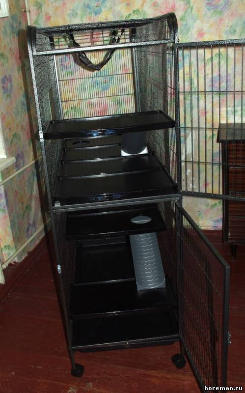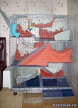 Купили клетку, поставили пару полок, обтянули их тканью, а эта засранка повадилась на самой верхней полке, ходить в туалет :-( поставили на это место миску с кормом, миска крепится к стенке, на крючки, так она это все дело перевода читает и делает свои дела:-( в итоге миска лежит в низу, в ее туалете...