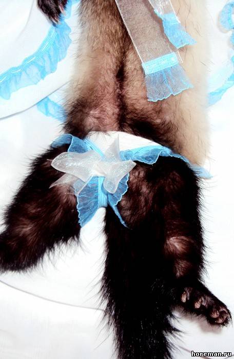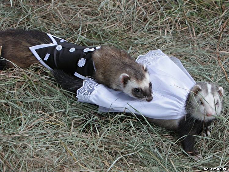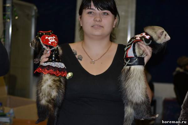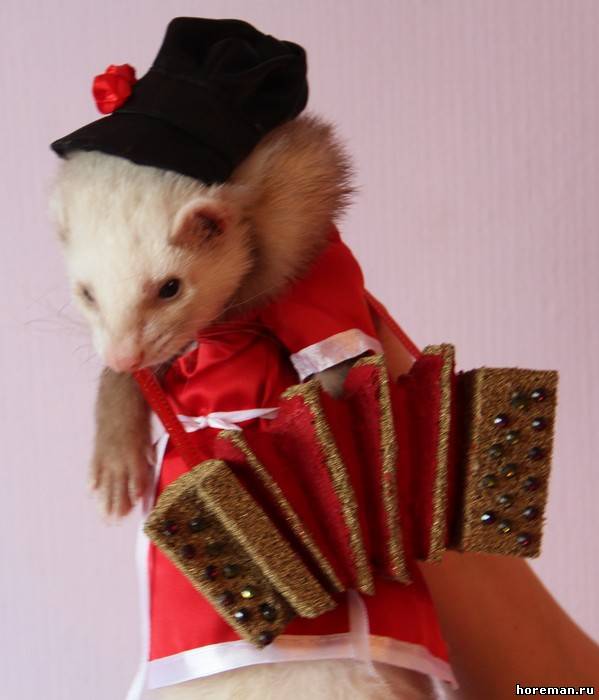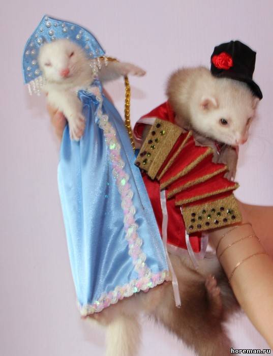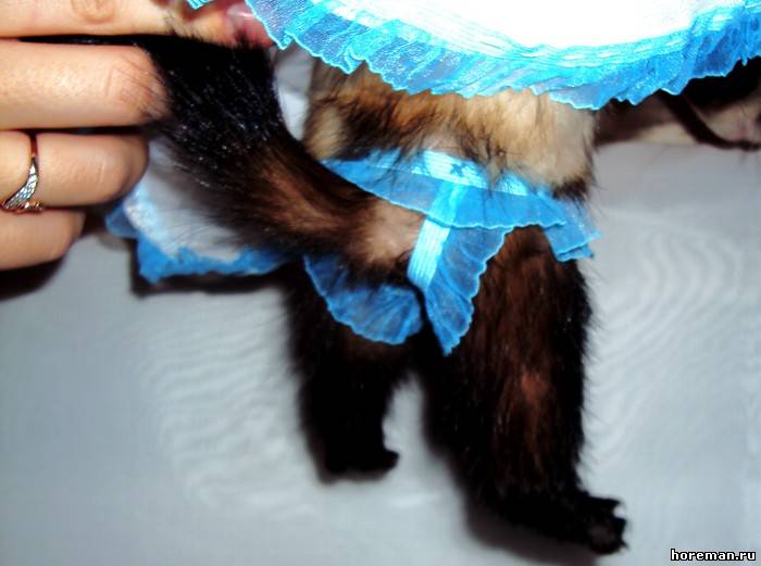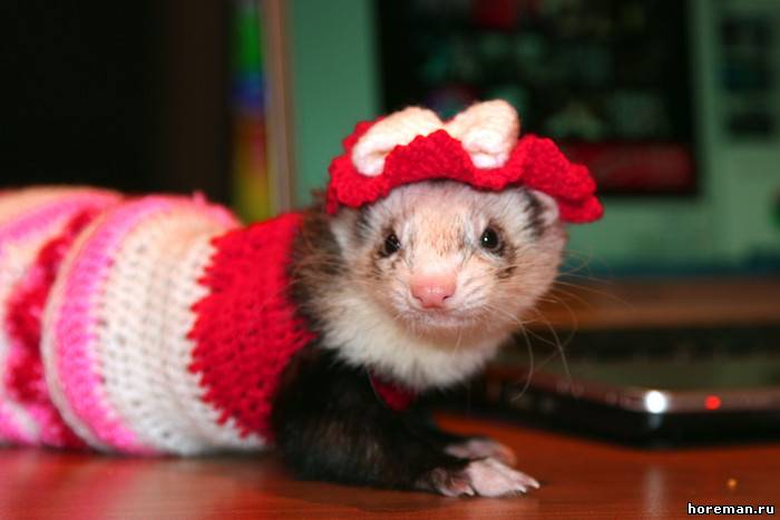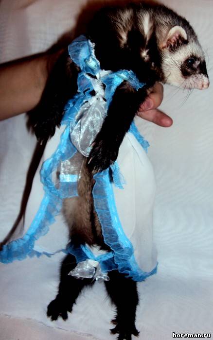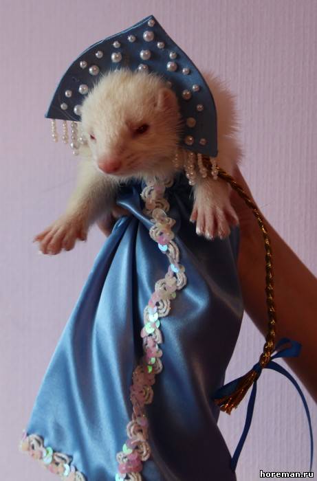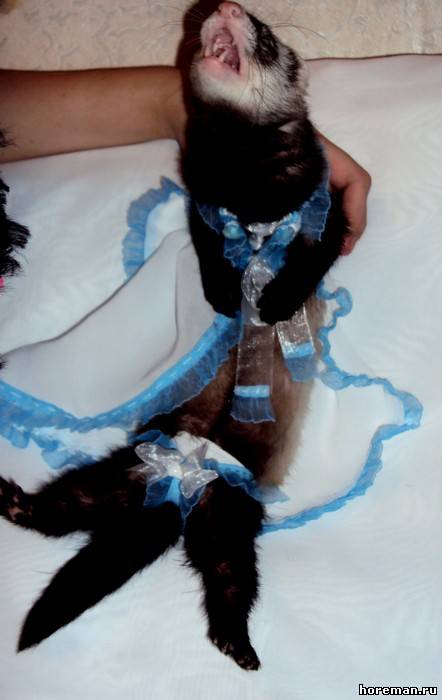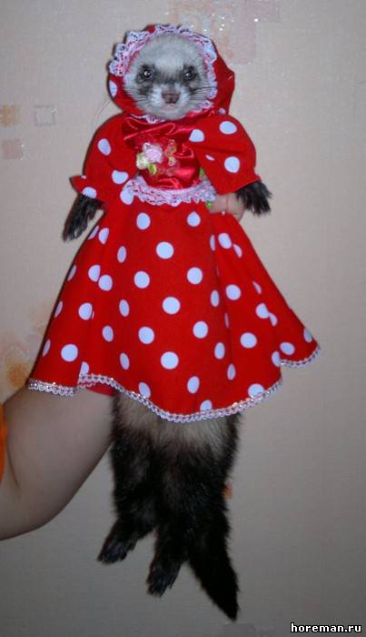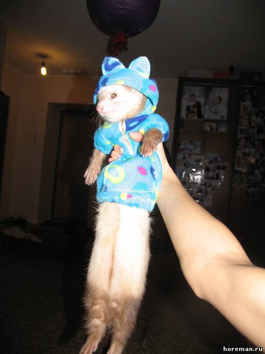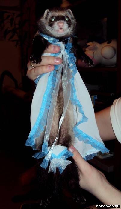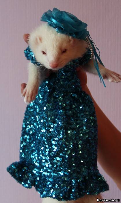 У нас *я надеюсь* не найдется таких людей, что захотят хорька носить в свитерке и в сумке)) Но одеть на тот же фотосет или на конкурс - никто его в нем ходить не заставляет))) а буквально минут 20 попозировать)) + если животное на это реагирует спокойно))